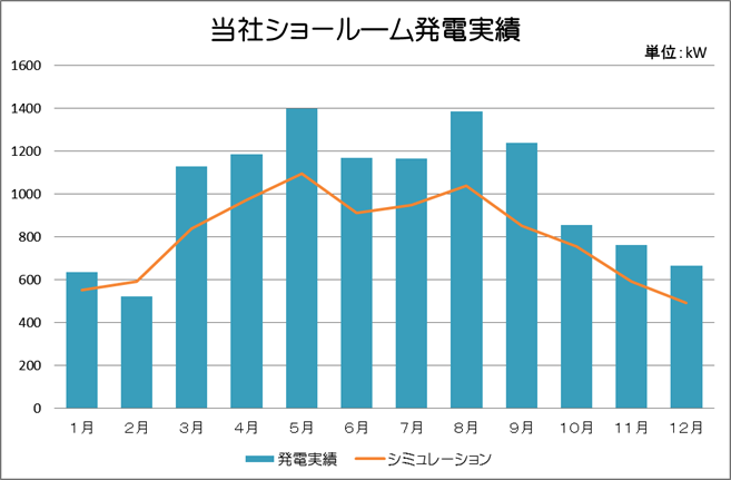 当社ショールームの屋根に設置している太陽光発電システムの実績です。